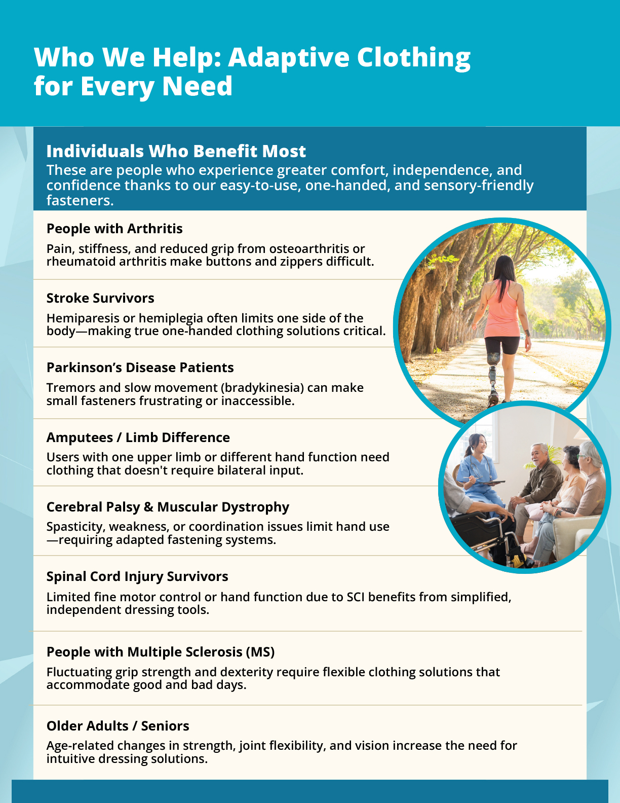 These are people who experience greater comfort, independence, and confidence thanks to our easy-to-use, one-handed, and sensory-friendly fasteners.